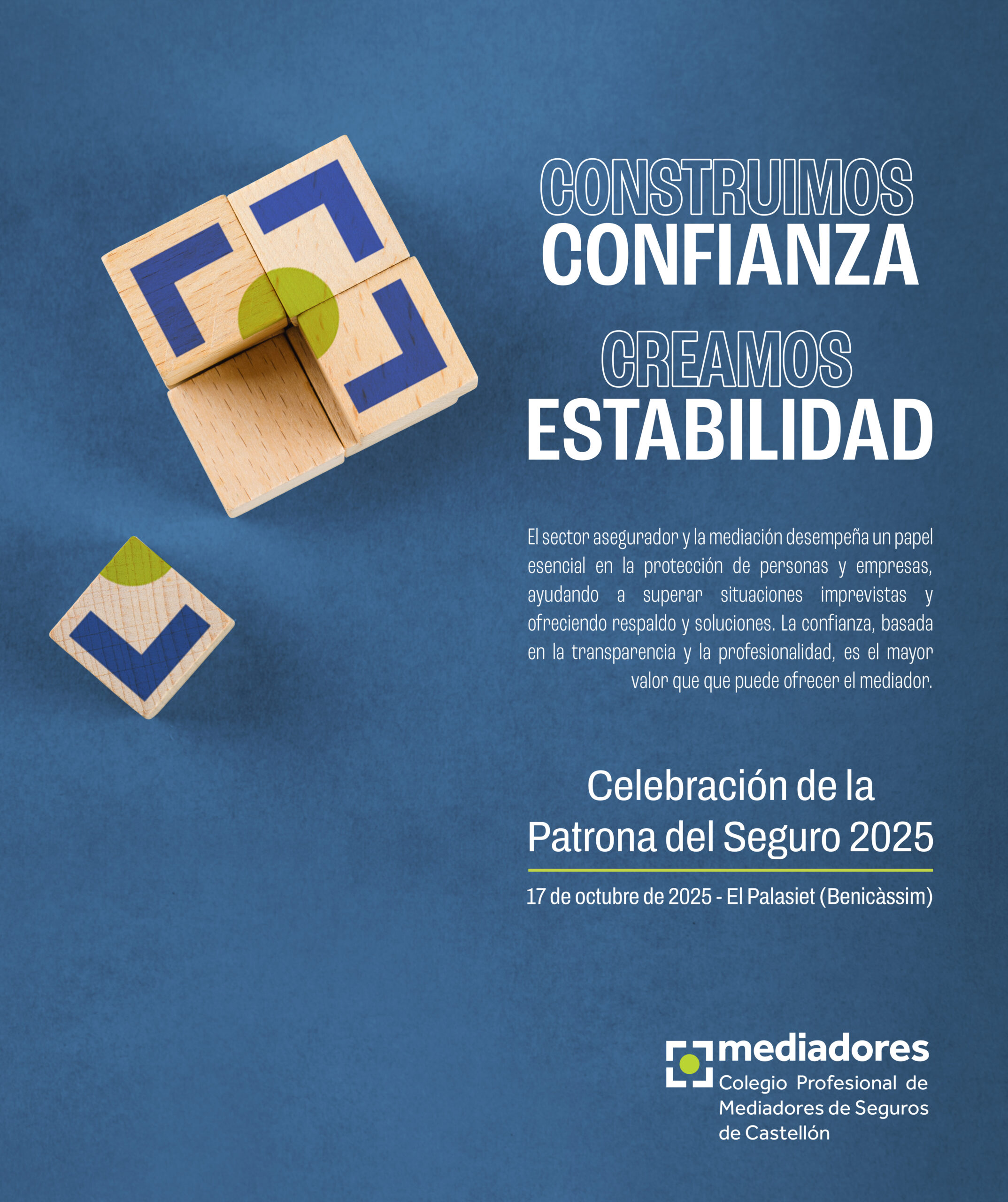 El próximo 17 de octubre celebraremos el encuentro anual del Colegio Profesional de Mediadores de Seguros de Castellón, que este año celebramos bajo el lema «Construimos confianza, creamos Estabilidad» en El Palasiet, en Benicàssim.